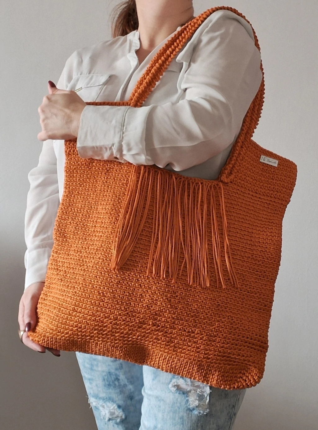 Contém botão imantado e sua alça trabalhada toda em crochê.